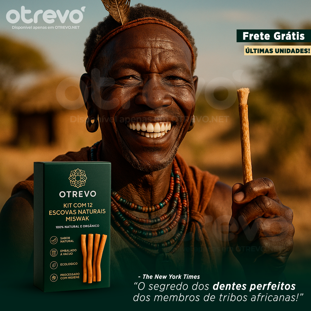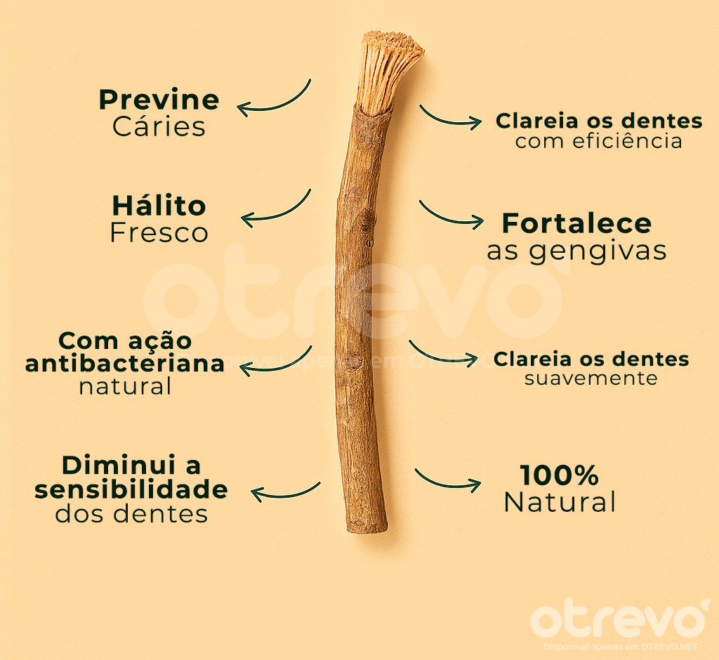 O Kit OTREVO Miswak é inspirado em um método de limpeza bucal usado há séculos em tribos africanas e asiáticas. 100% natural, ele clareia os dentes rapidamente, fortalece o esmalte, protege as gengivas e combate o mau hálito de forma duradoura. Uma solução prática, eficaz e totalmente natural para um sorriso branco e saudável.